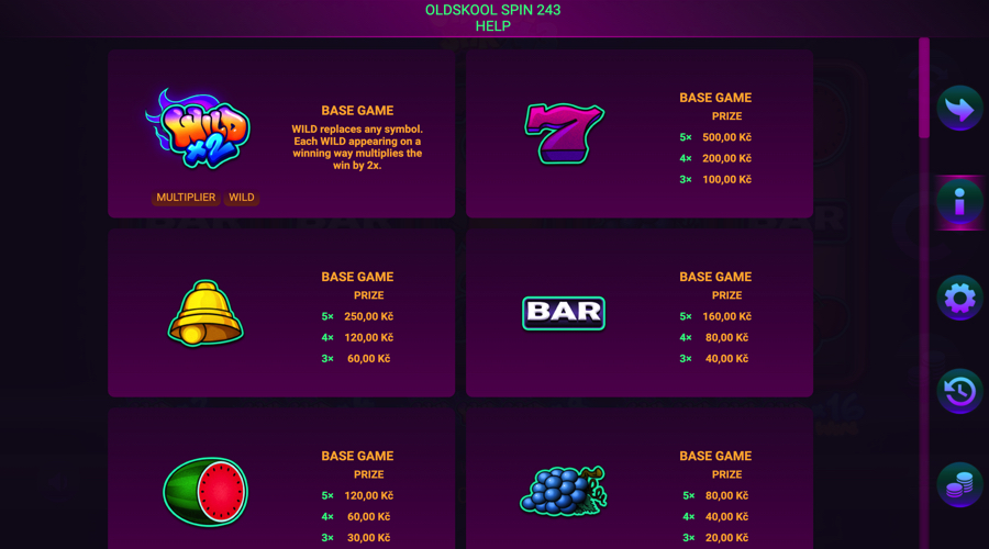 Oldskool Spin 243 běží na pěti válcích a třech řadách a vyplácí prostřednictvím enginu s 243 způsoby, který počítá shodné symboly na sousedních válcích zleva doprava.