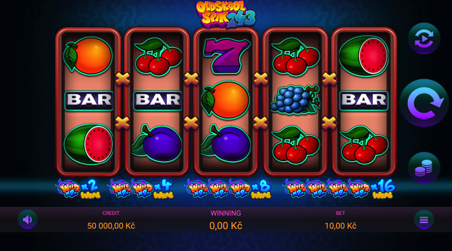 Oldskool Spin 243 udržuje prezentaci nabitou, s klasickými ikonami ovoce a symboly skříněk, které se čistě čitelně dělí na pětiválcové a třířádkové mřížce.